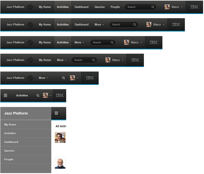 As we were working on the tech preview of the Jazz Platform Home app, we naturally wanted it to behave on phones and tablets. And it did. The header in particular is a breathing, living thing, going through a number of metamorphoses until a desktop caterpillar turns into a mobile butterfly: