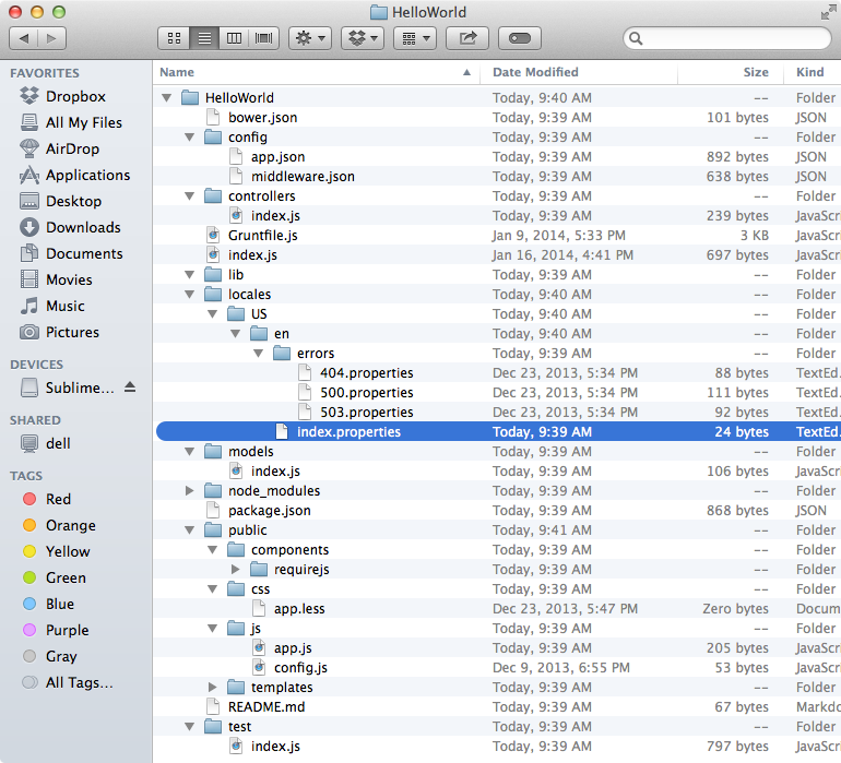 - Templates – Kraken uses Dust, which fits our needs like a glove, and the templates are located in the public folder so that they can be served to both Node.js and the browser, allowing template sharing. Of course, templates are pre-compiled into JS files for performance reasons.
