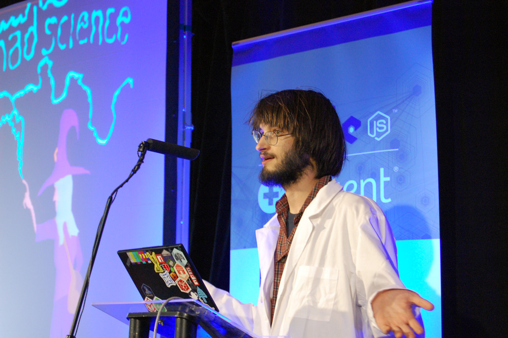Day three of Nodeconf.eu started with a ‘Mad Science Act’, with all the presenters trading the pre-requisite lab coat (to add ‘science’ and also a bit of ‘mad’ to their presentations).