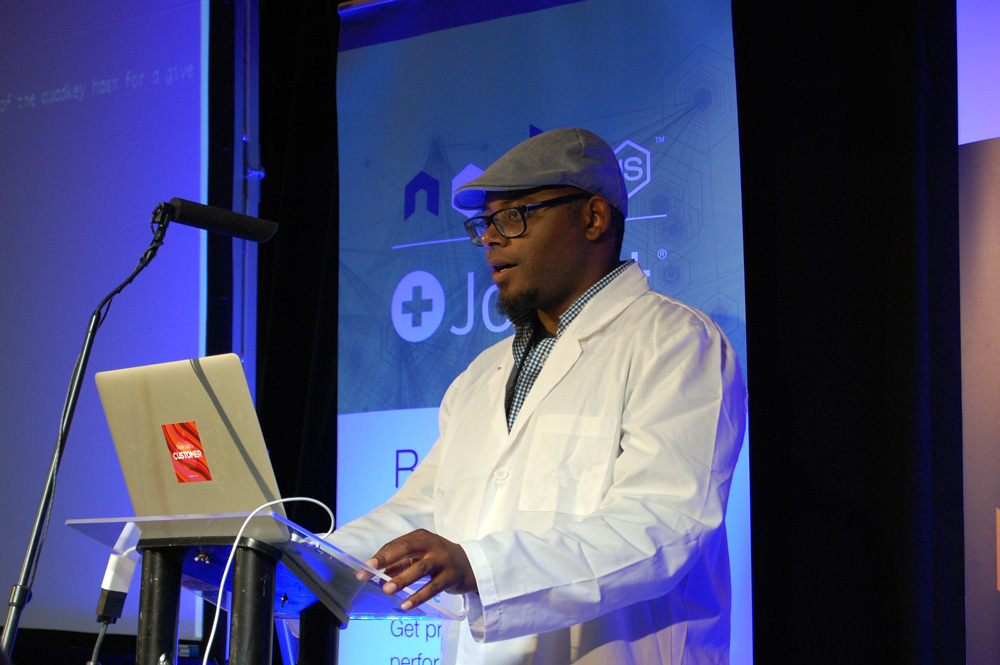 Travell Perkins, Fidelity Investments CTO had a talk that I could not immediately place in this block and that got me confused until I realized that it was originally supposed to be on Monday, as part of the ‘Node.js in the enterprise’ section (lab coat notwithstanding). I *think* his talk was about databases, possibly his SQLdown NPM module, but sadly I cannot locate my notes on the talk (too much coffee?).