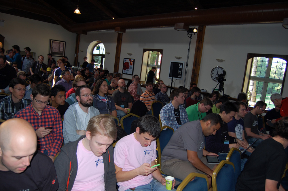 The last talk in this long-ish section was Mikola Lysenko on the challenges of developing multi-player online games using Web technologies alone. A key problem to solve is replication because multi-player games are distributed but they share state, and this state needs to be replicated in a way that does not ruin the real-time nature of the game. He demonstrated several options in modeling real time physical systems and their pros and cons (which, in case of ‘eventual consistency’ and error correction can yield some comical side effects as seen in the demo). You can read more on his work in his multi-part blog post.