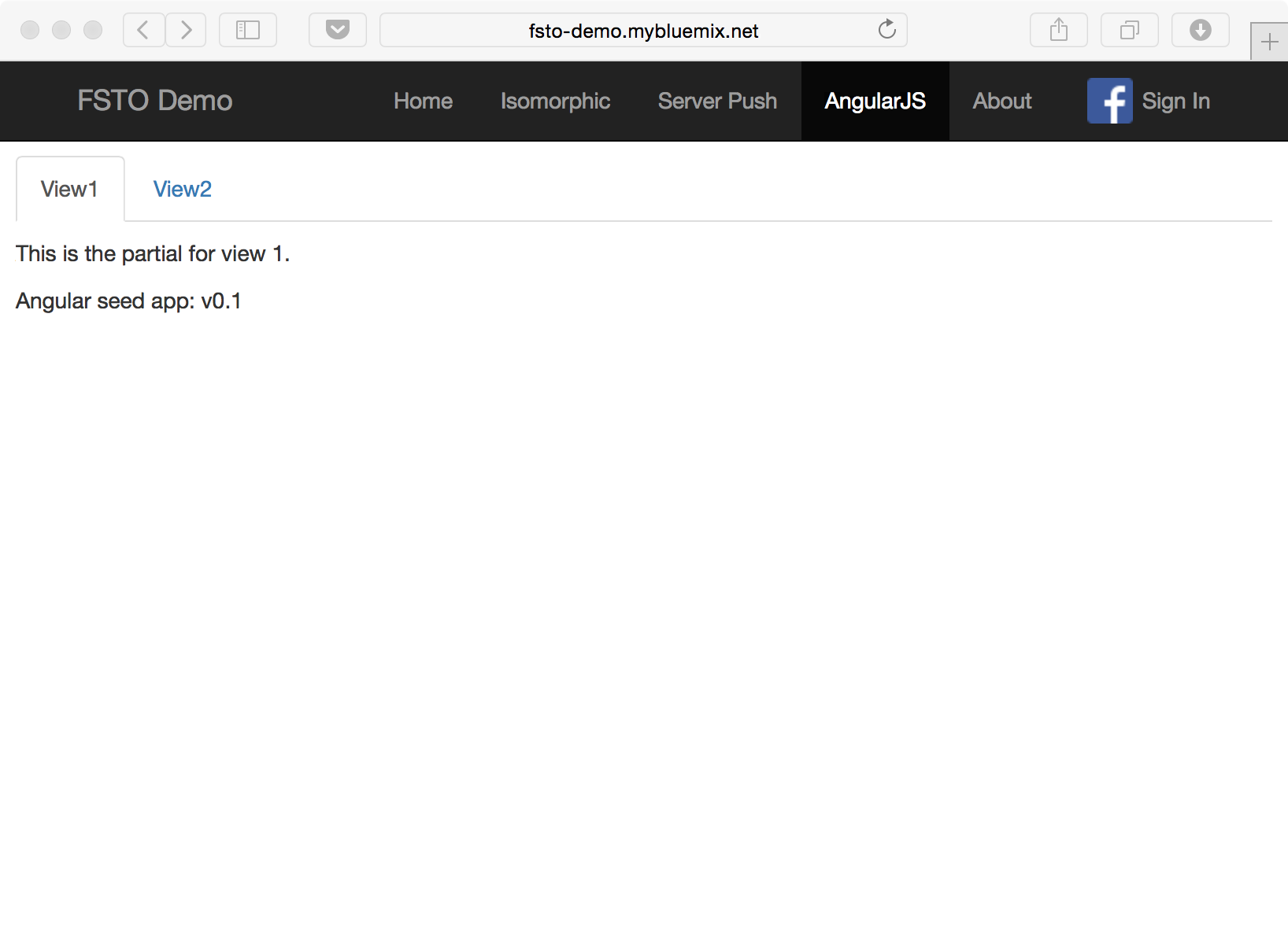 The thing is, this page is really a single-page app folded in, and a NodeJS micro-service sends AngularJS content to the browser, where it takes over. In the page, there are two Angular ‘pages’ that are selectable with two tabs. Clicking on the tabs activates Angular router with HTML5 mode enabled. As a result, these ‘pages’ have normal URLs (‘/angular-seed/view1’ and ‘/angular-seed/view2’).