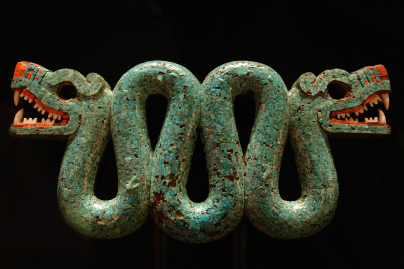 Two-headed turquoise serpent. Mixtec-Aztec, 1400-1521. Held at British Museum. Credits: Wikimedia Commons.